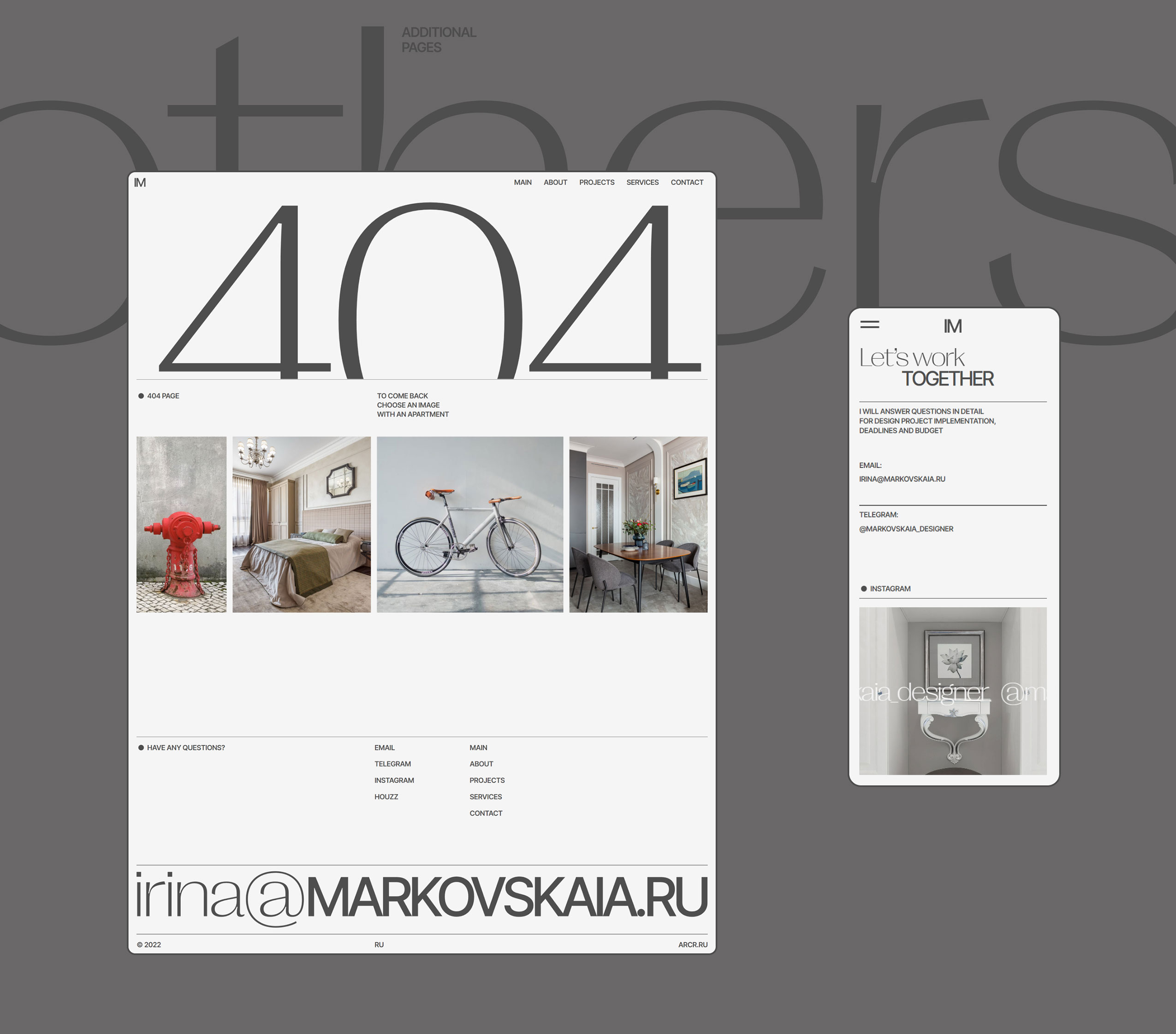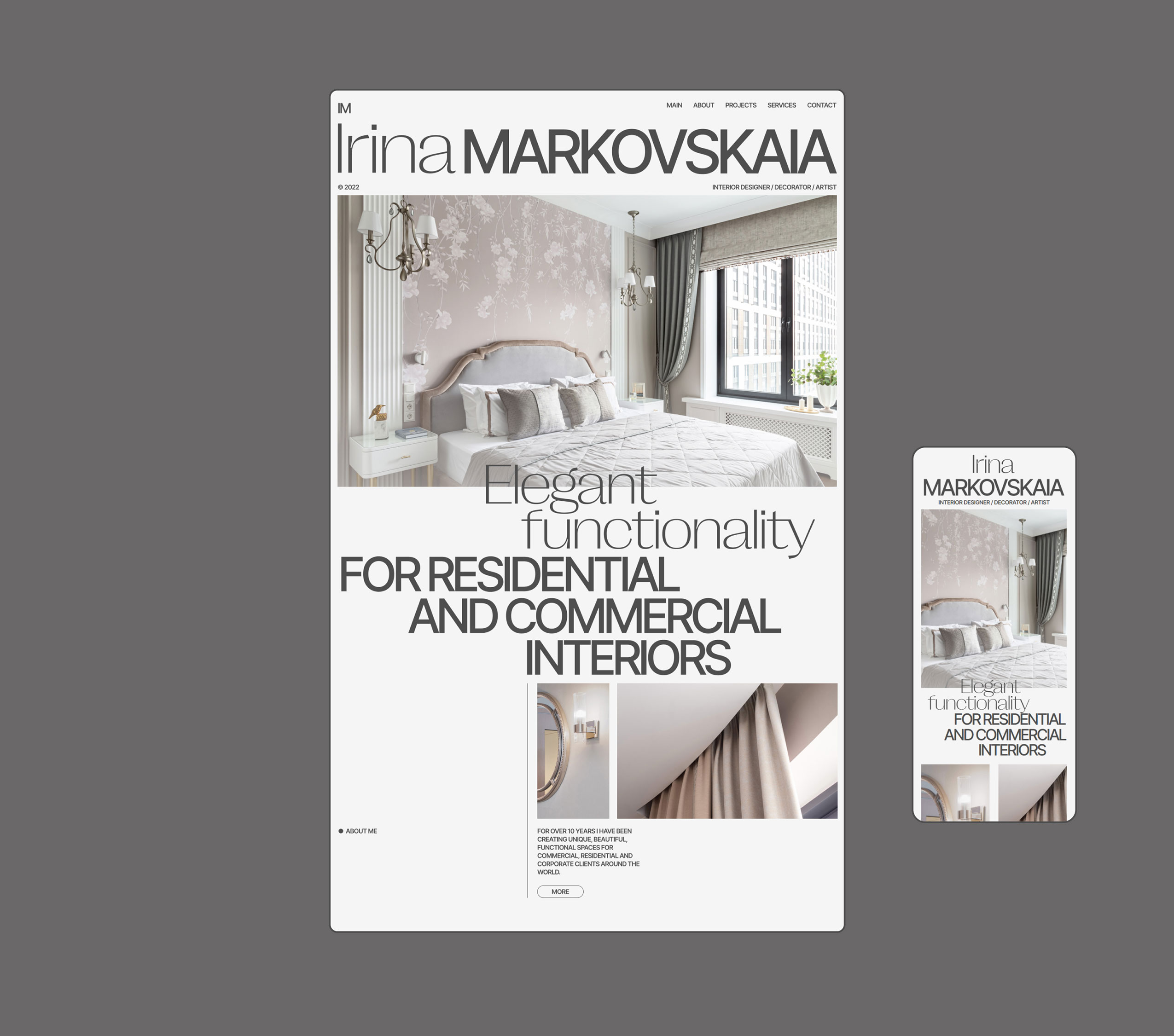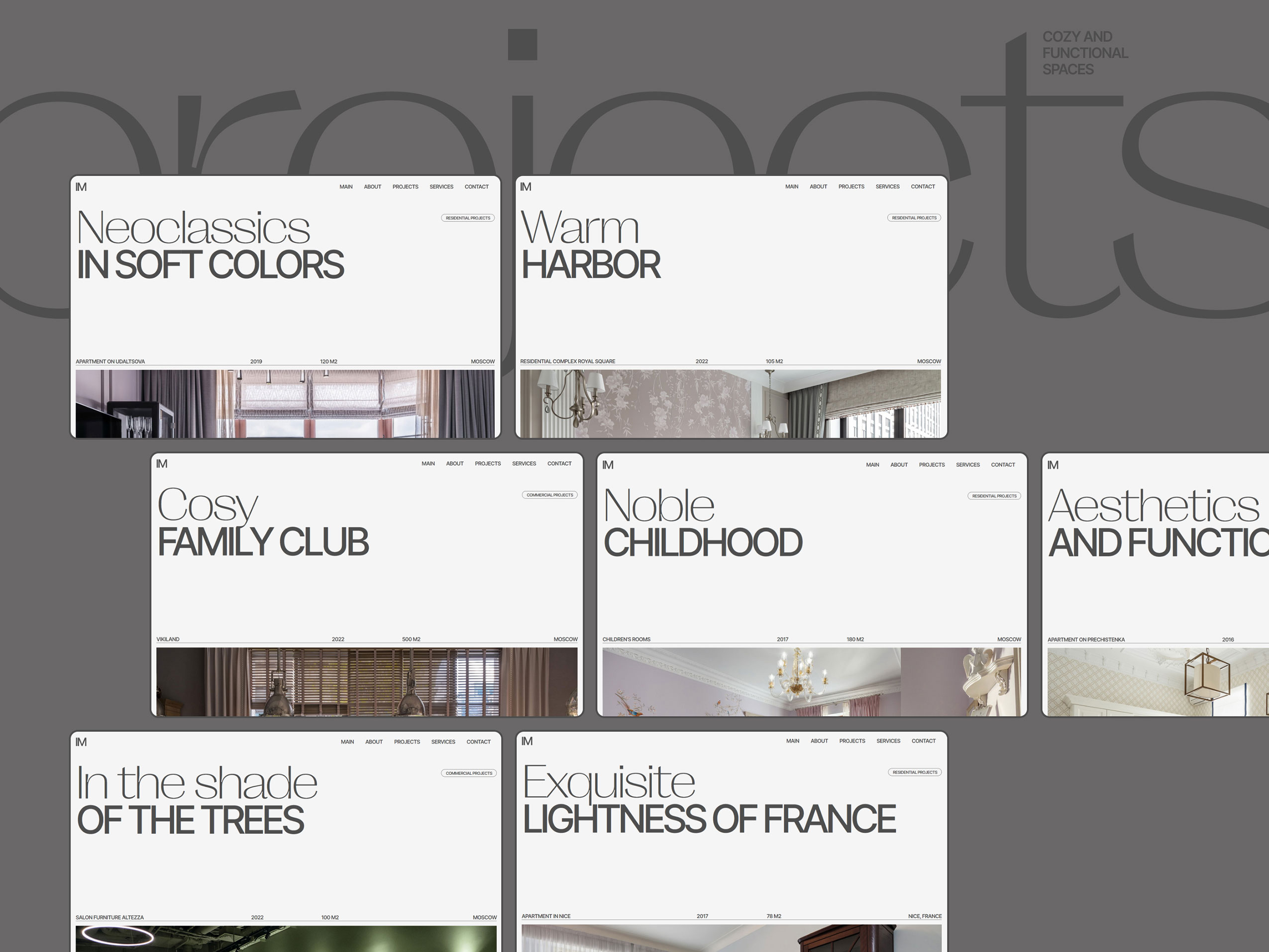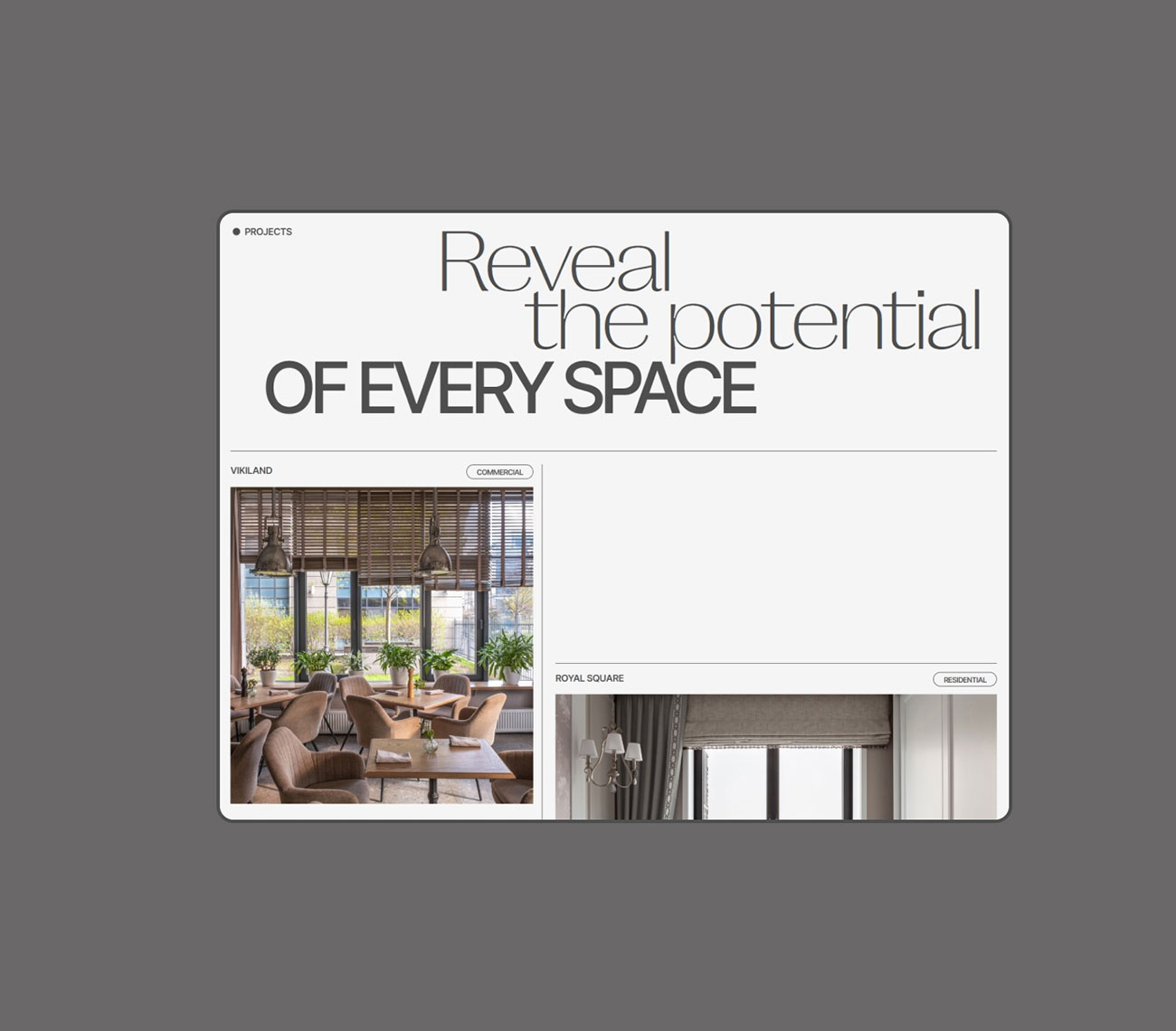 Website redesign for an interior designer. The focus is shifting from residential to commercial spaces, so the new concept of the site was built at the intersection of the essences of aesthetics and functionality, editorial design, drawing elements, maximum typographic display with the addition of expanded and transparent interaction conditions.