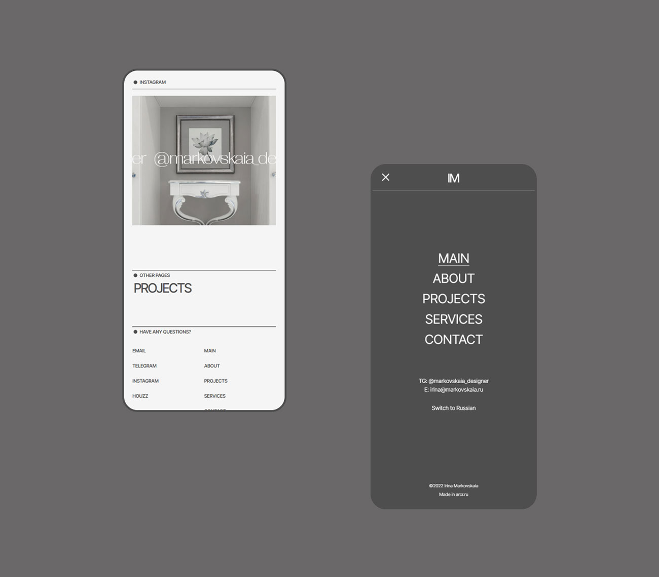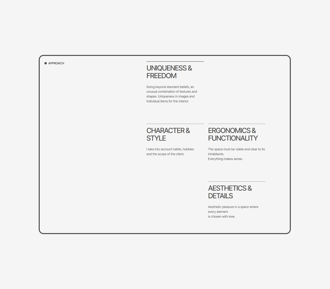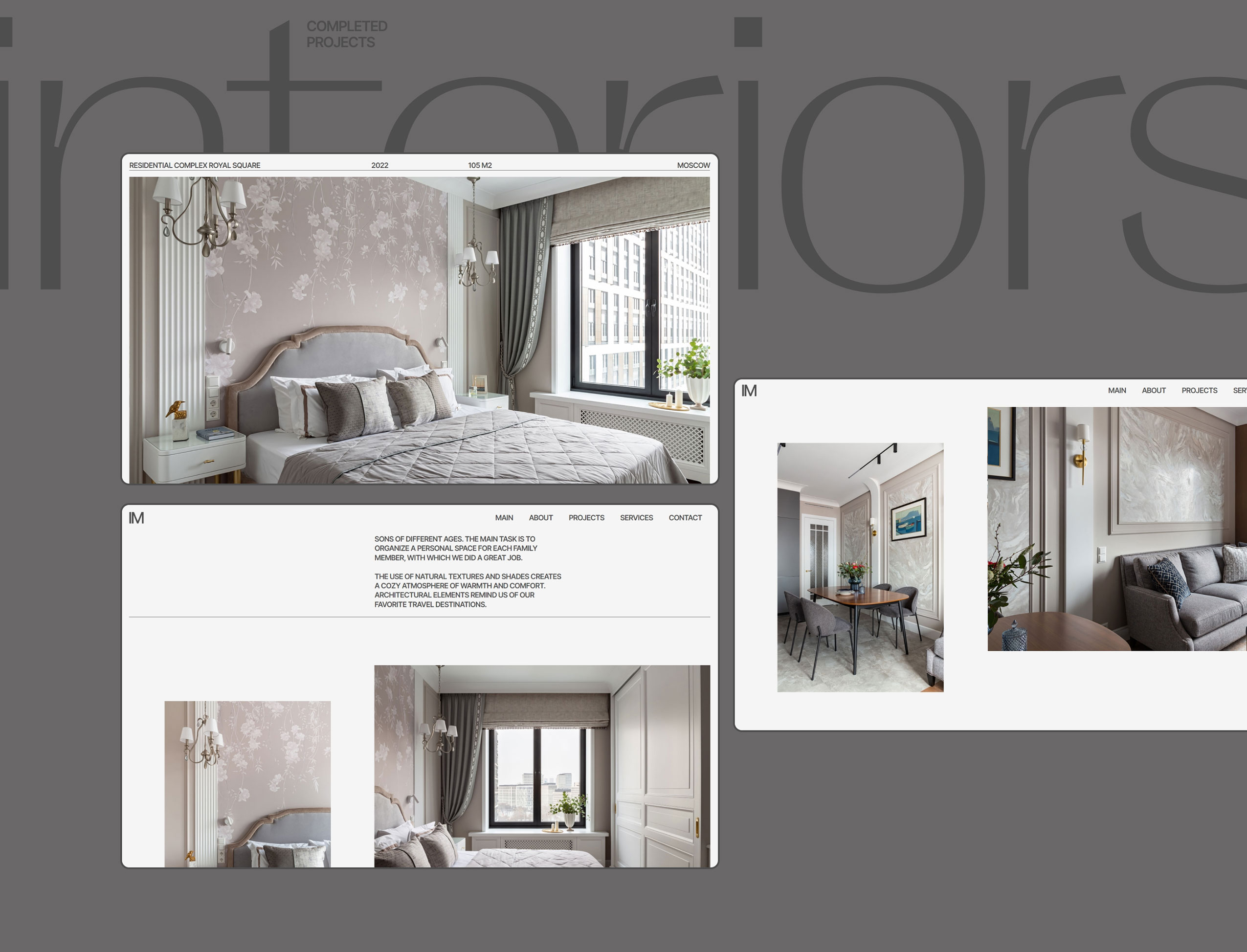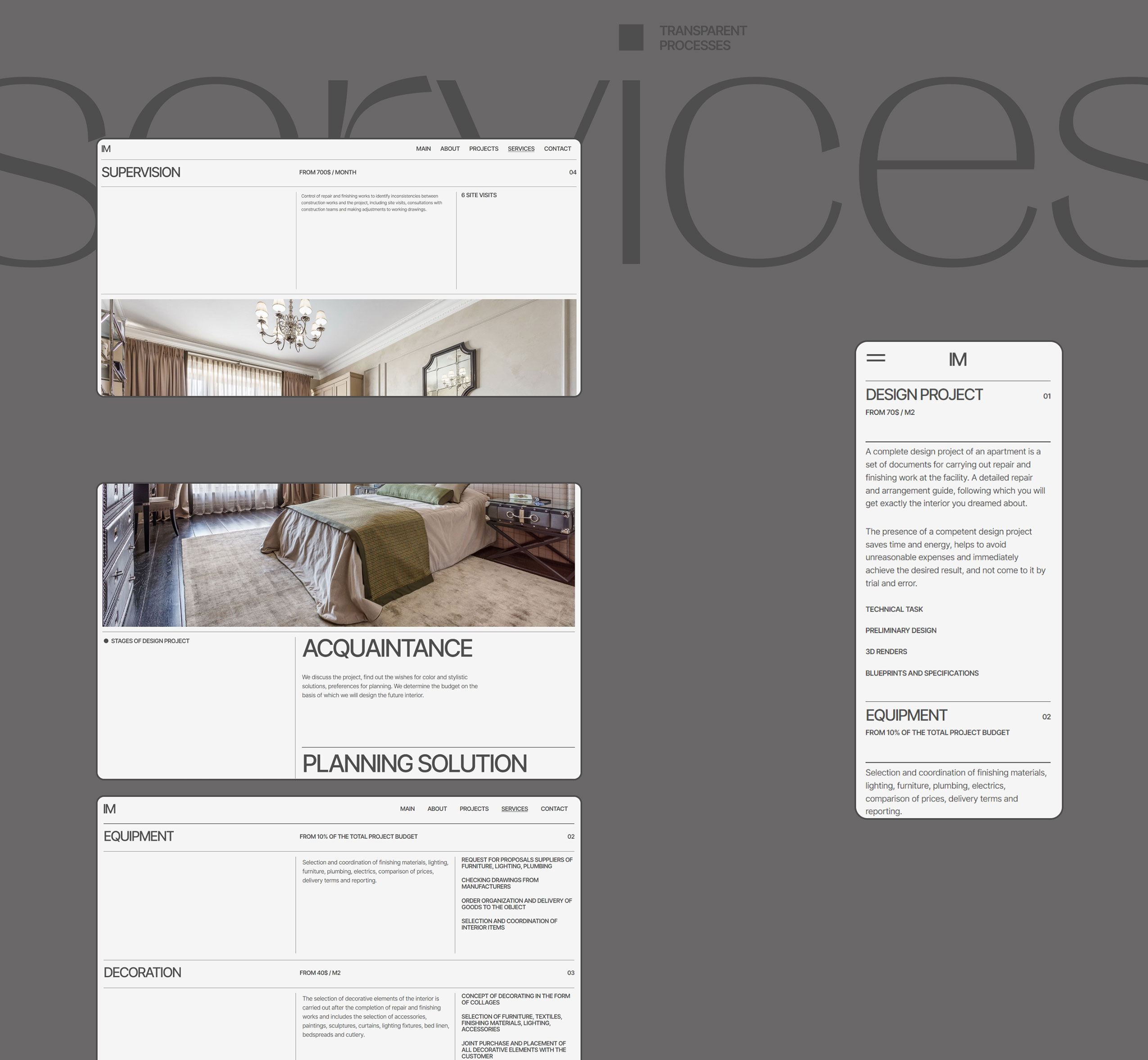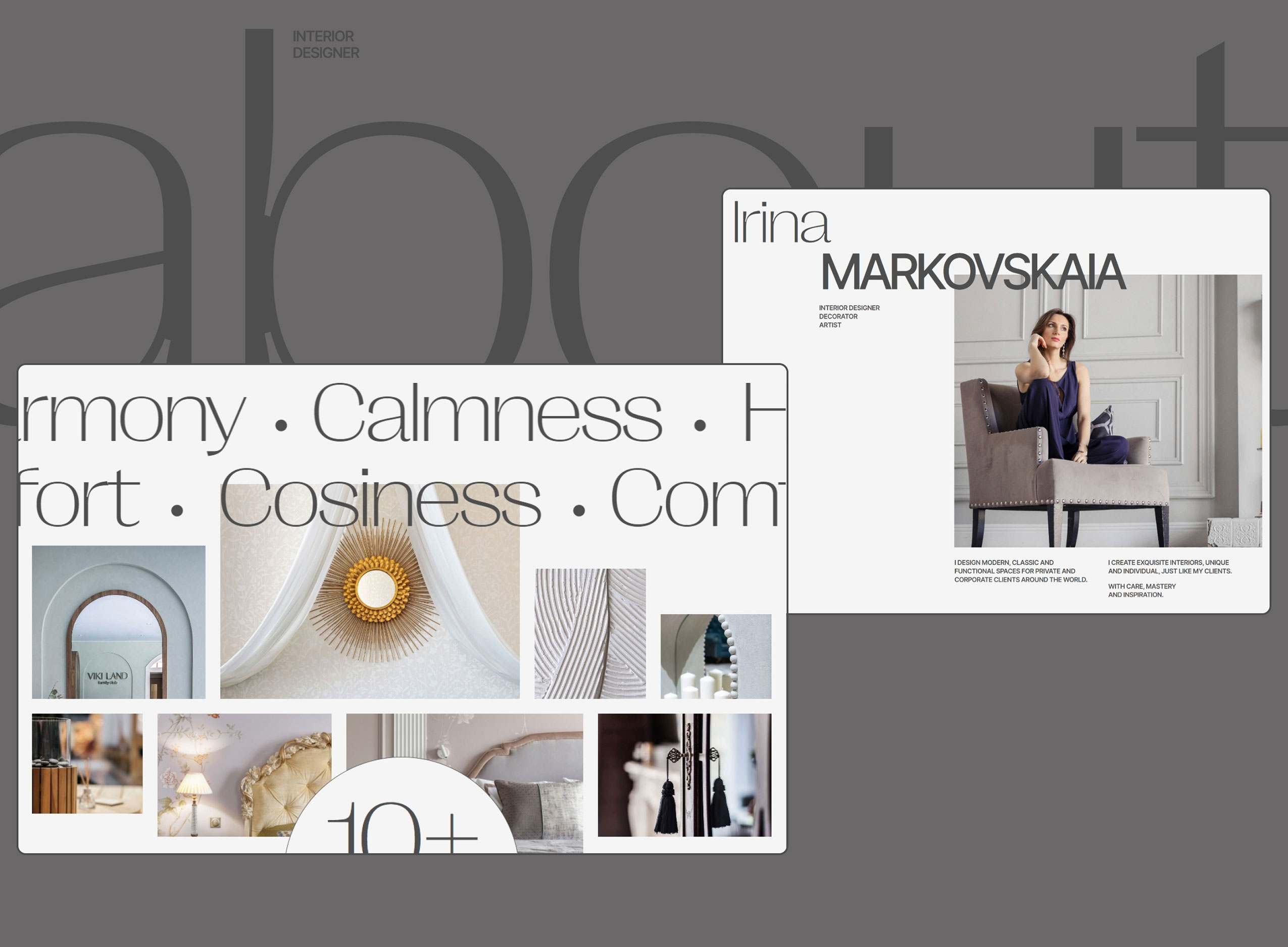 Website redesign for an interior designer. The focus is shifting from residential to commercial spaces, so the new concept of the site was built at the intersection of the essences of aesthetics and functionality, editorial design, drawing elements, maximum typographic display with the addition of expanded and transparent interaction conditions.
