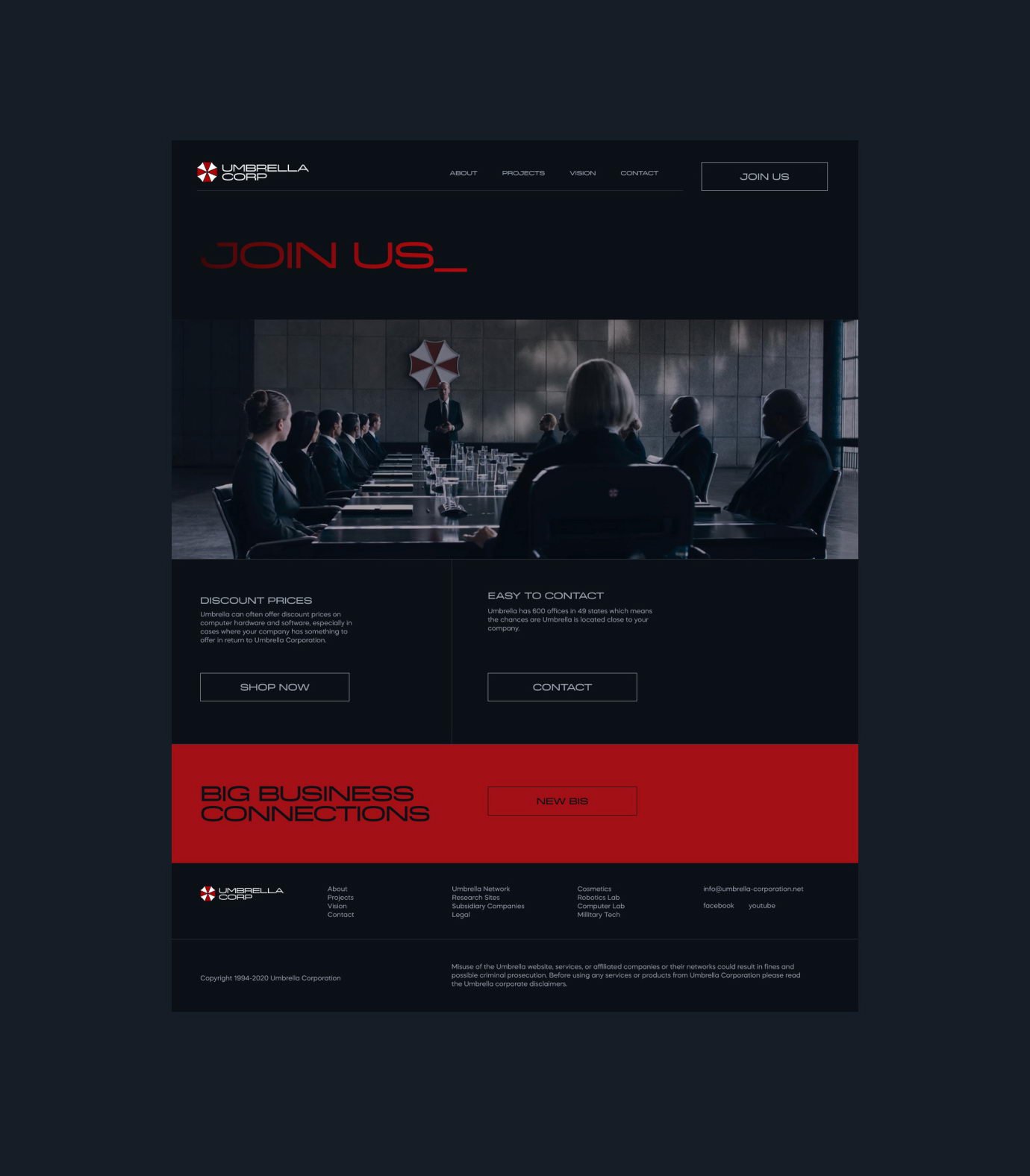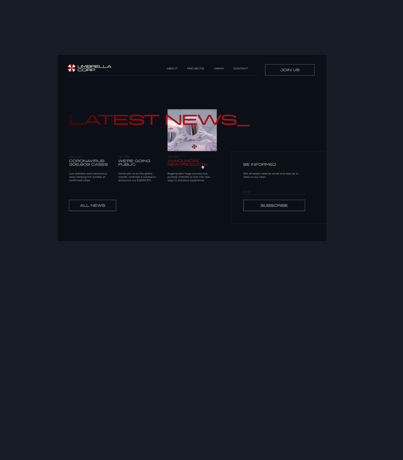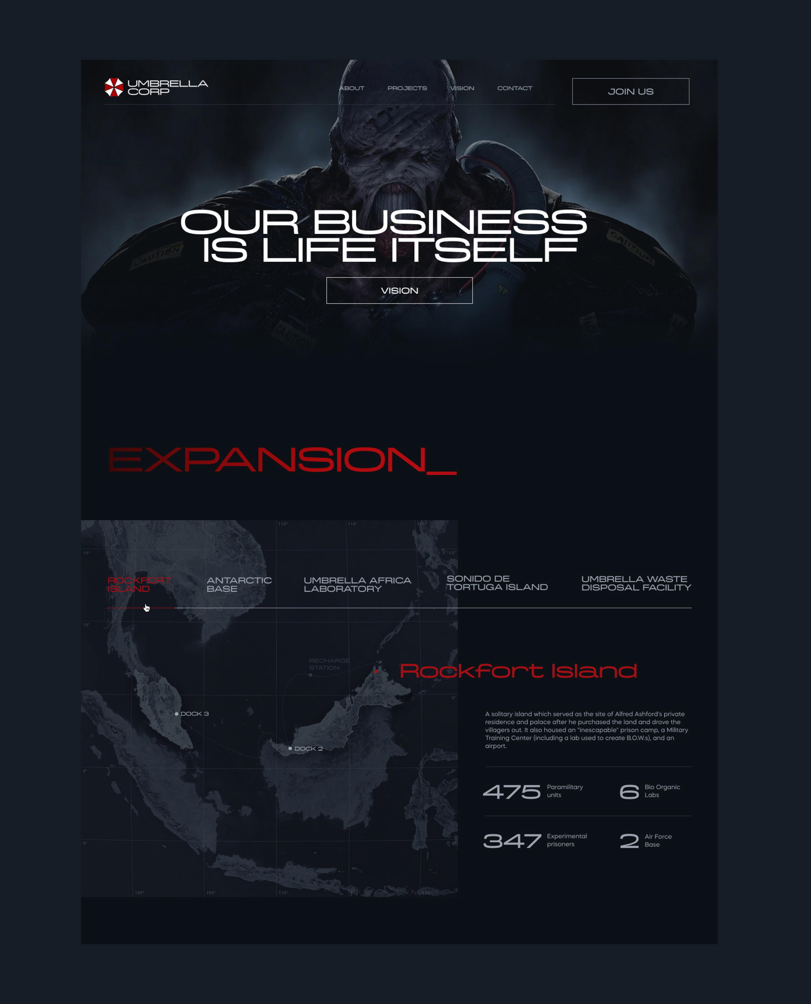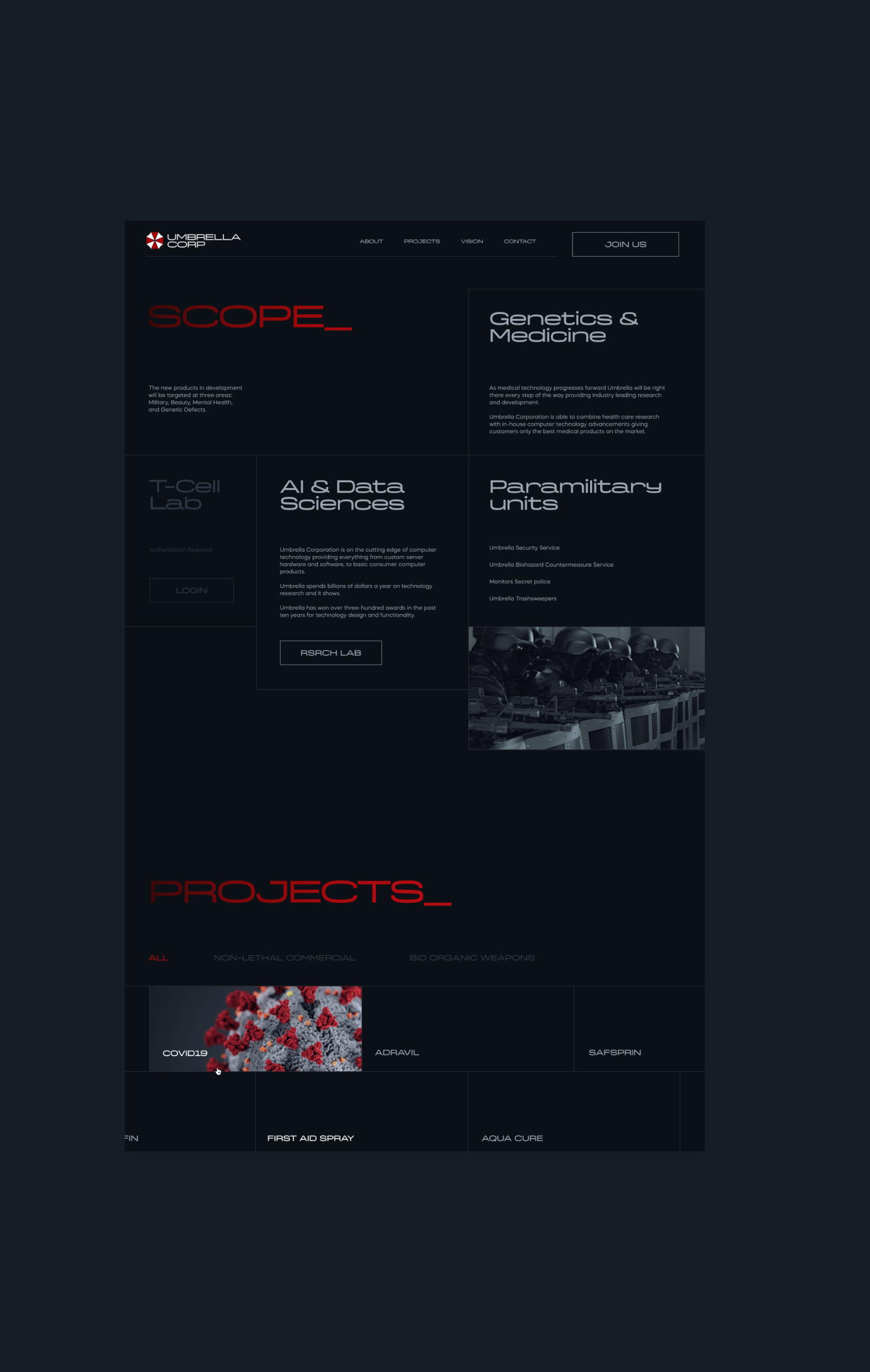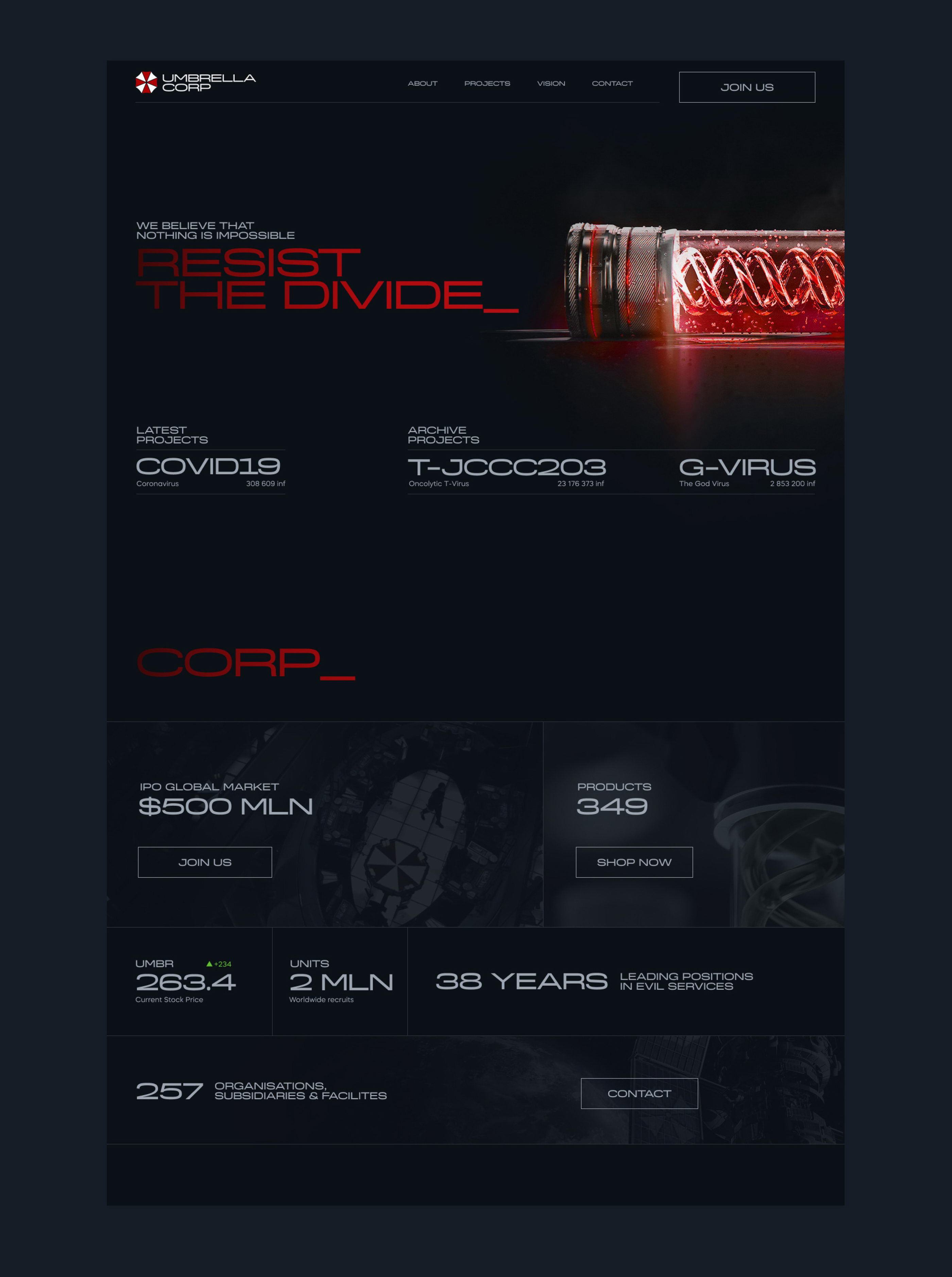 The design provides for a dark company positioning and participation in developing viruses, including coronavirus, genetic research and biological weapons. Technological contrasts with bright typography and promo blocks for deep immersion in the atmosphere of evil.