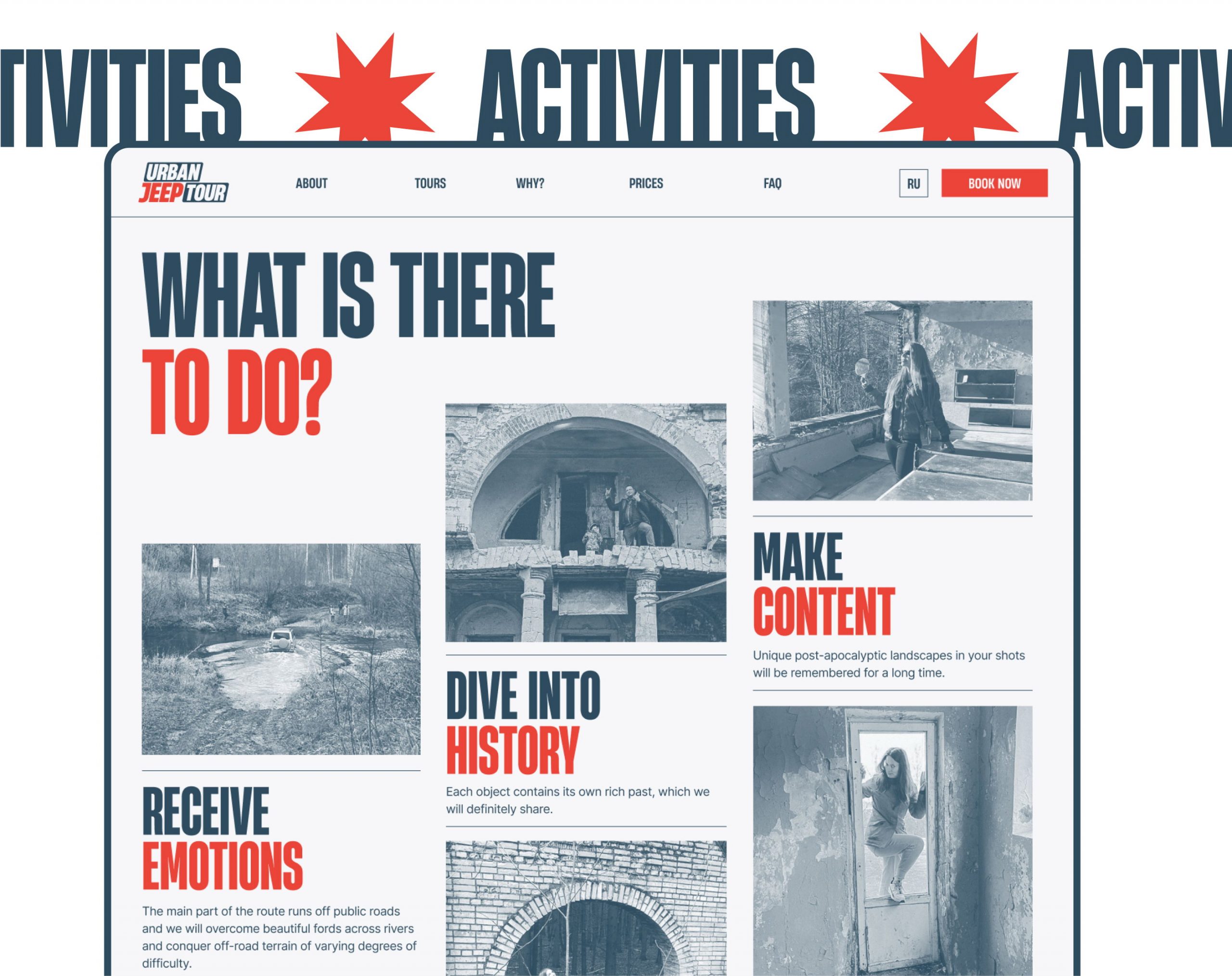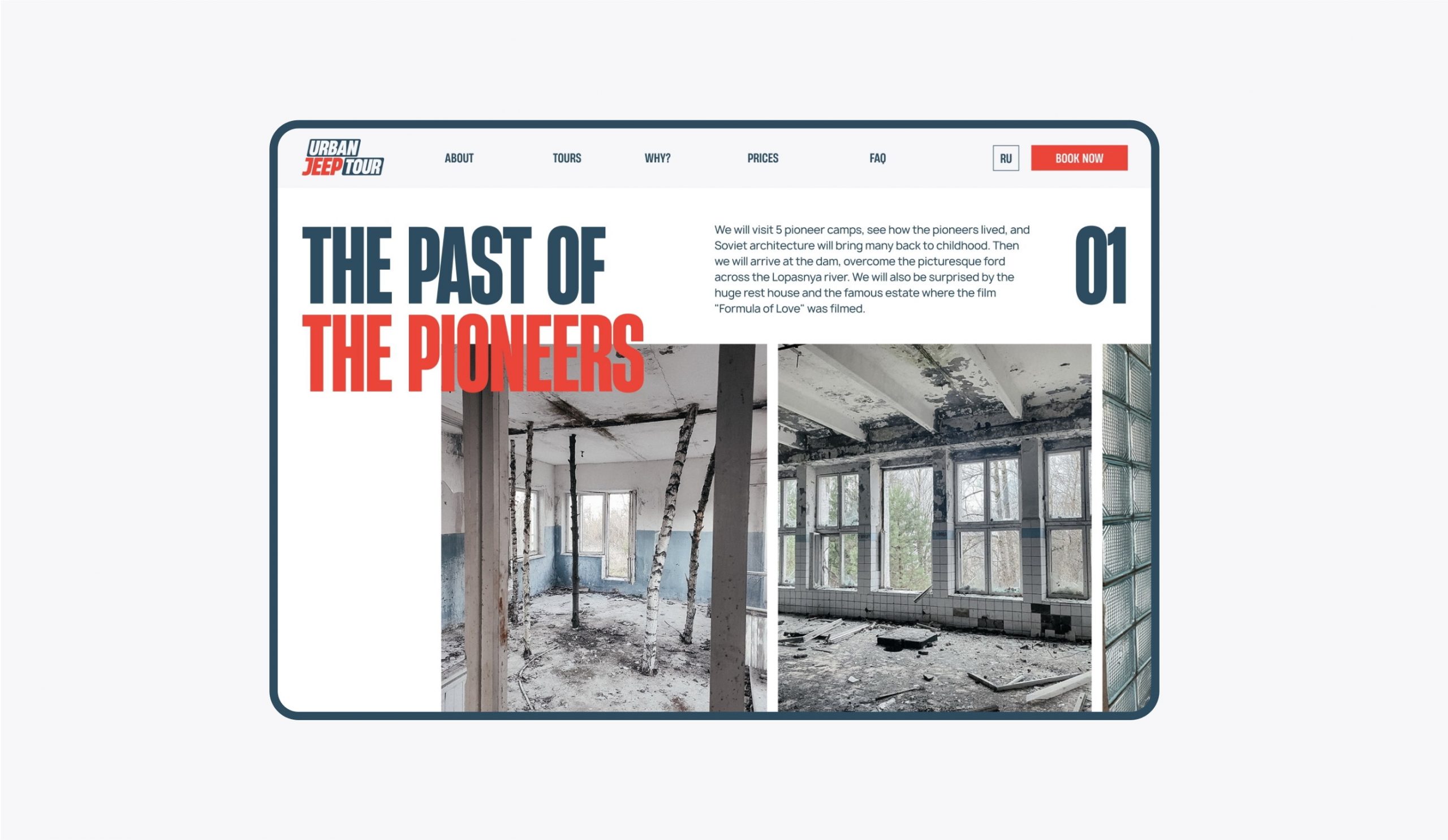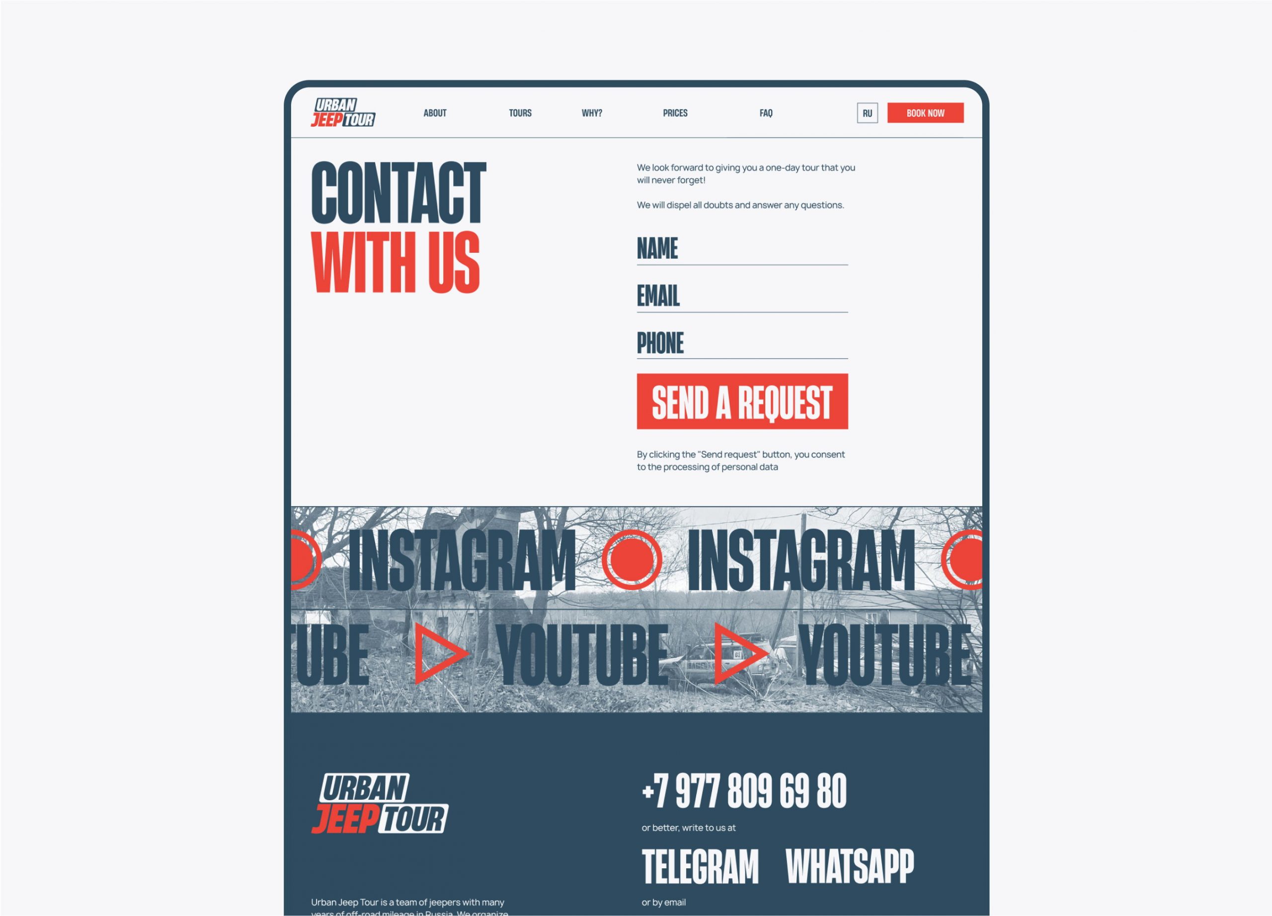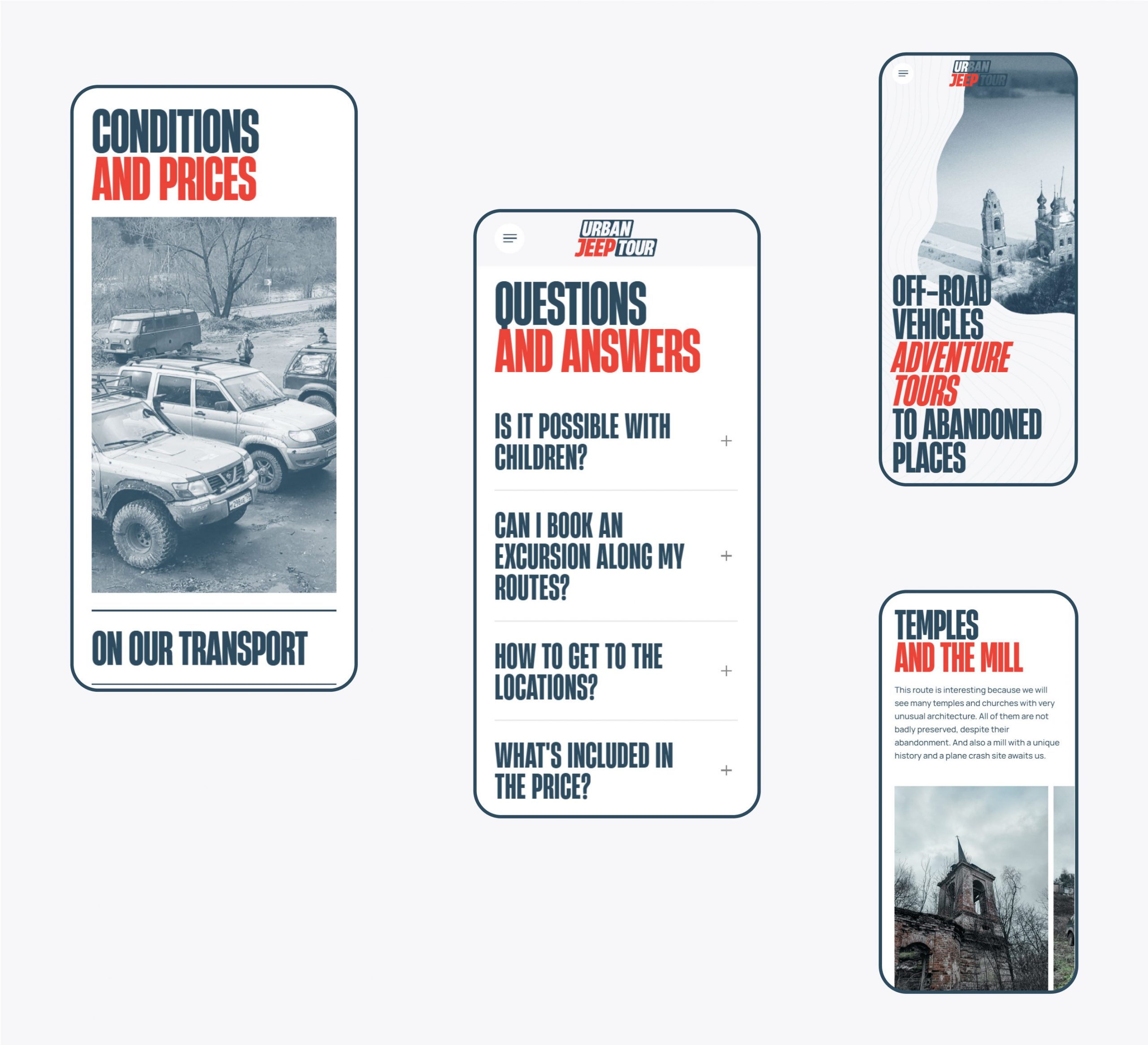 We have developed a minimalistic, brutal and dynamic style, emphasizing with spectacular micro-animations that repeat the real movements of SUVs and immerse the visitor in the atmosphere of off-road racing.